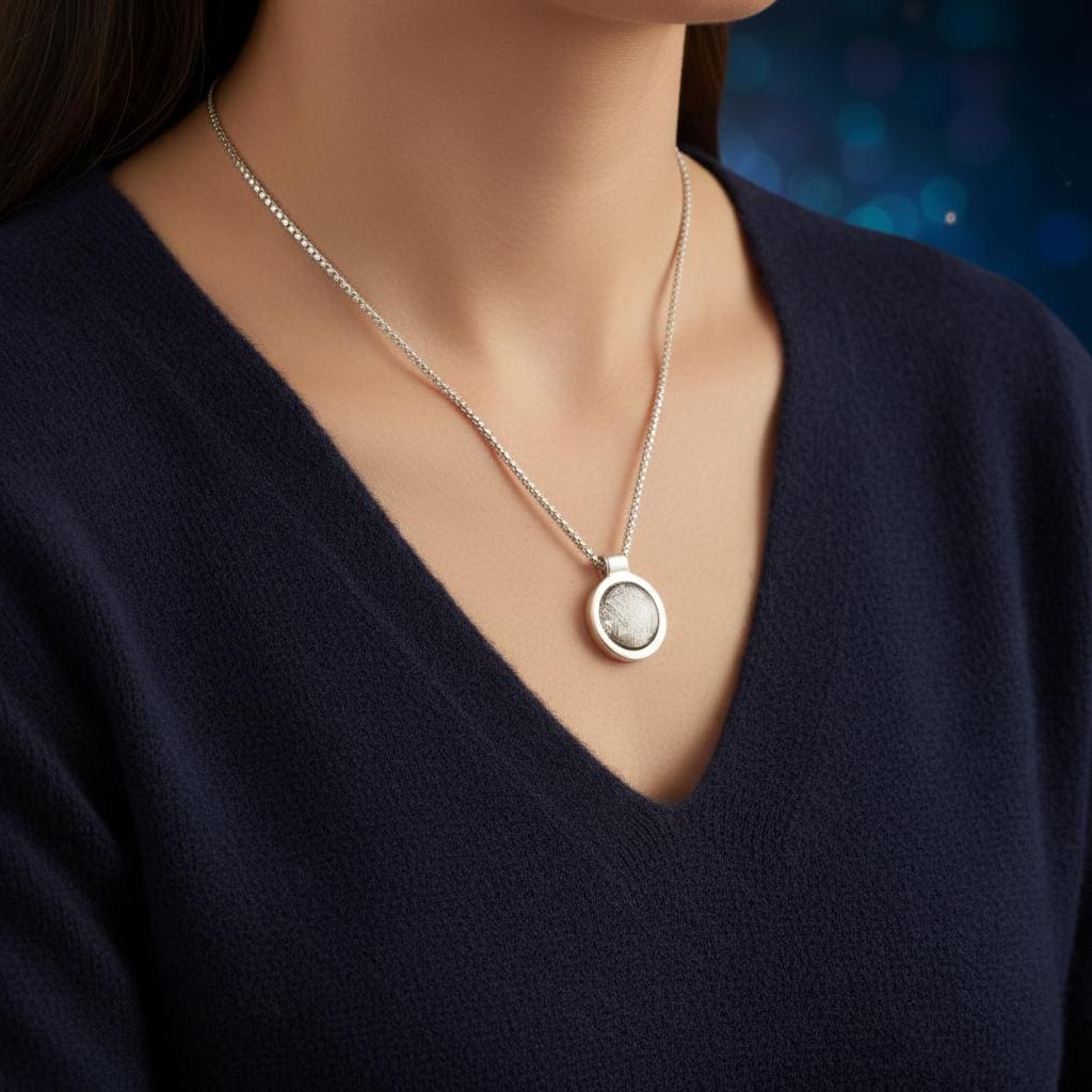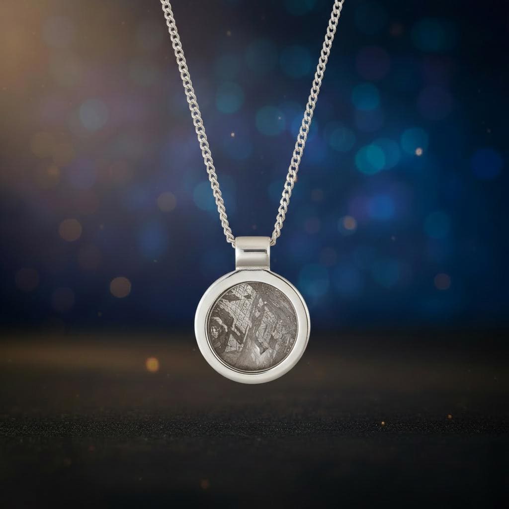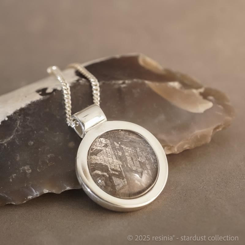 Die runde Form und der breite Silberrand fassen das Material bewusst zurückhaltend. So bleibt der Fokus vollständig auf der Struktur des Meteoriten.