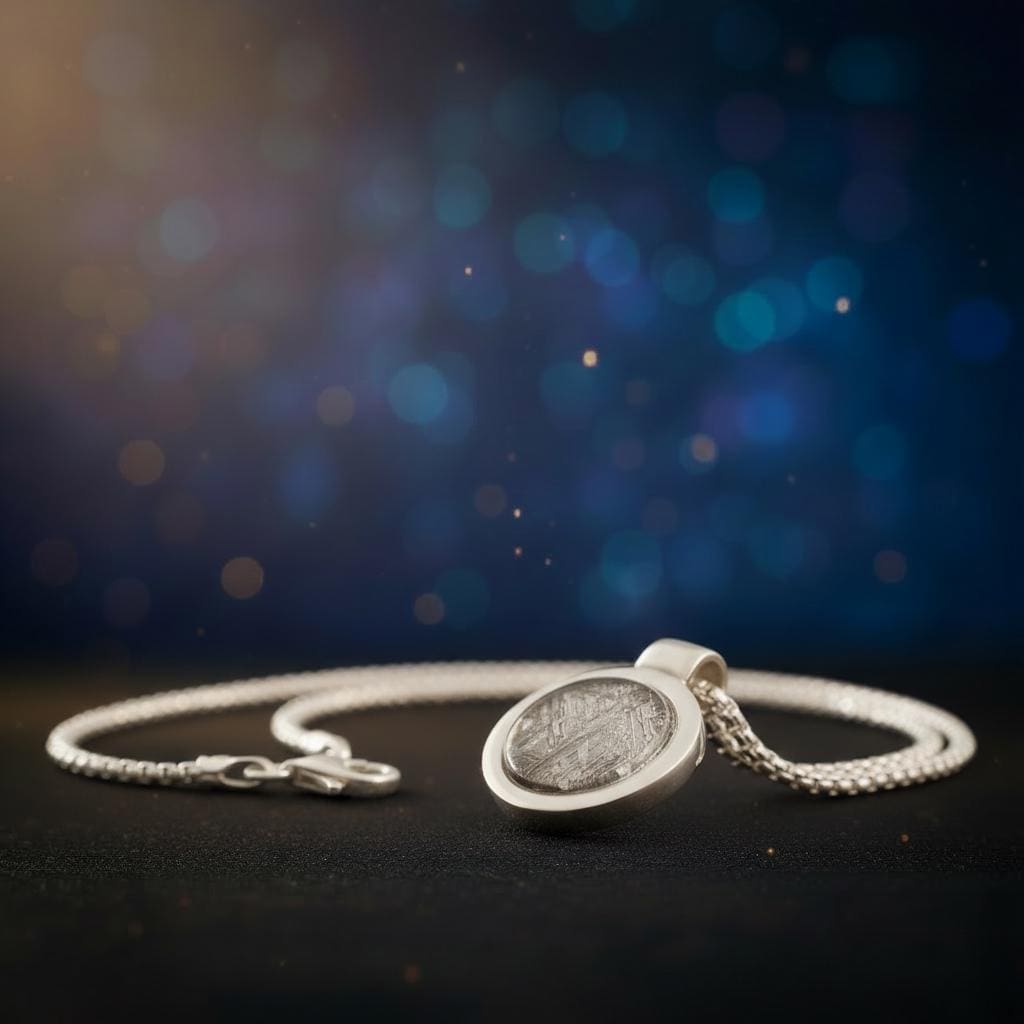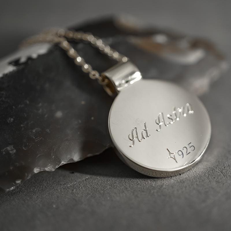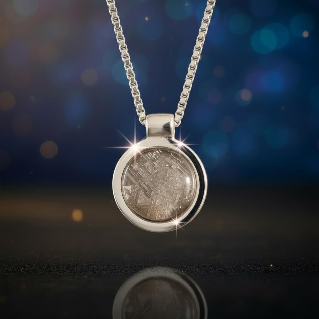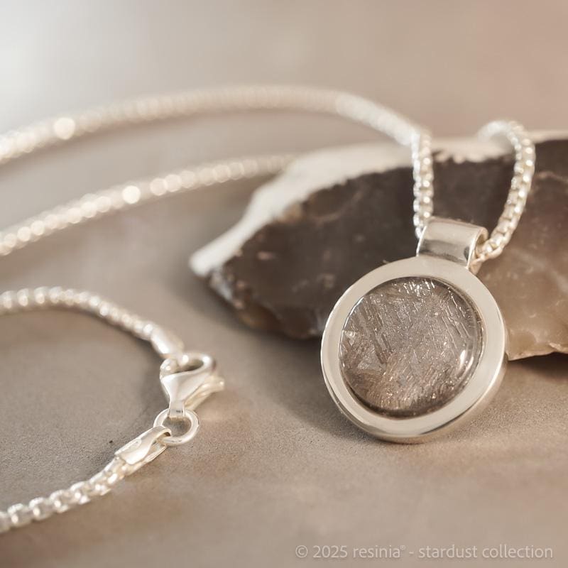 Das Amulett „Saturn S“ zeigt einen echten Muonionalusta-Meteoriten in einer klaren Fassung aus 925 Silber.