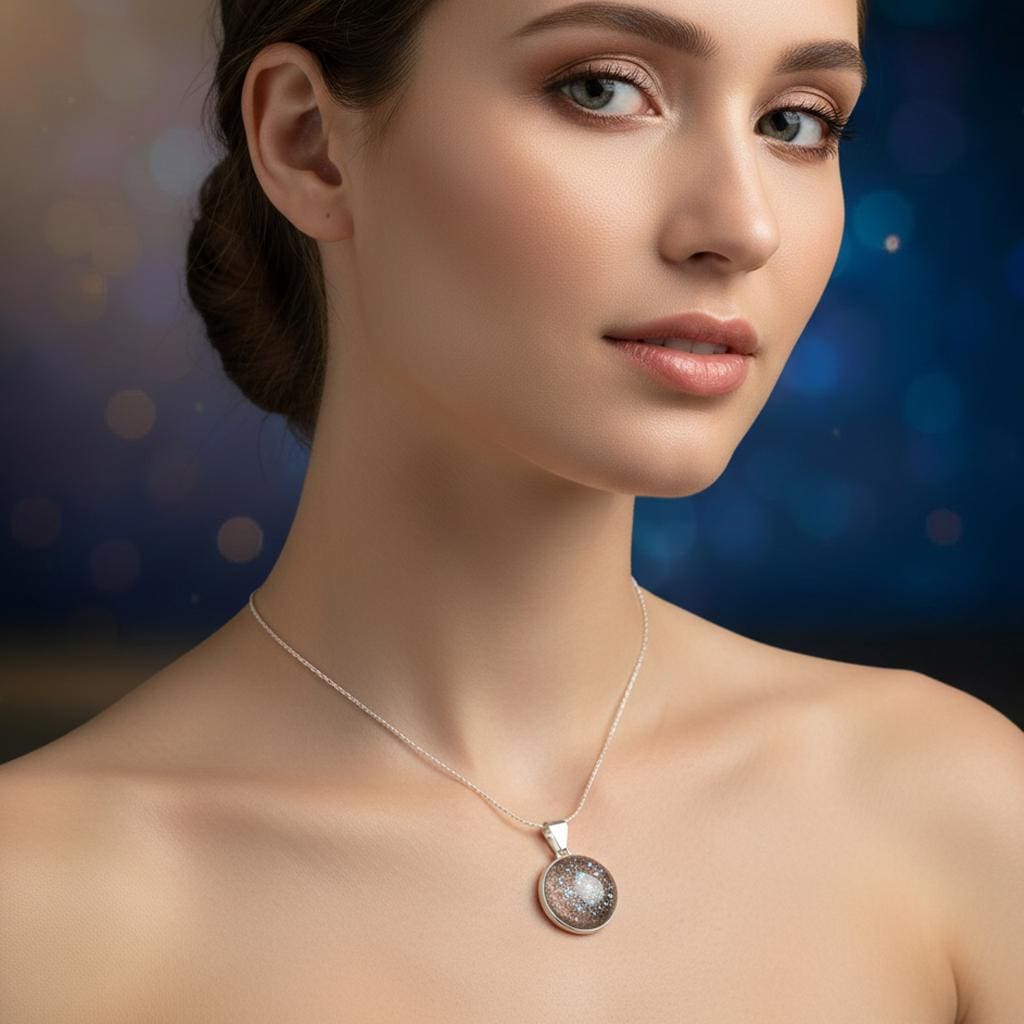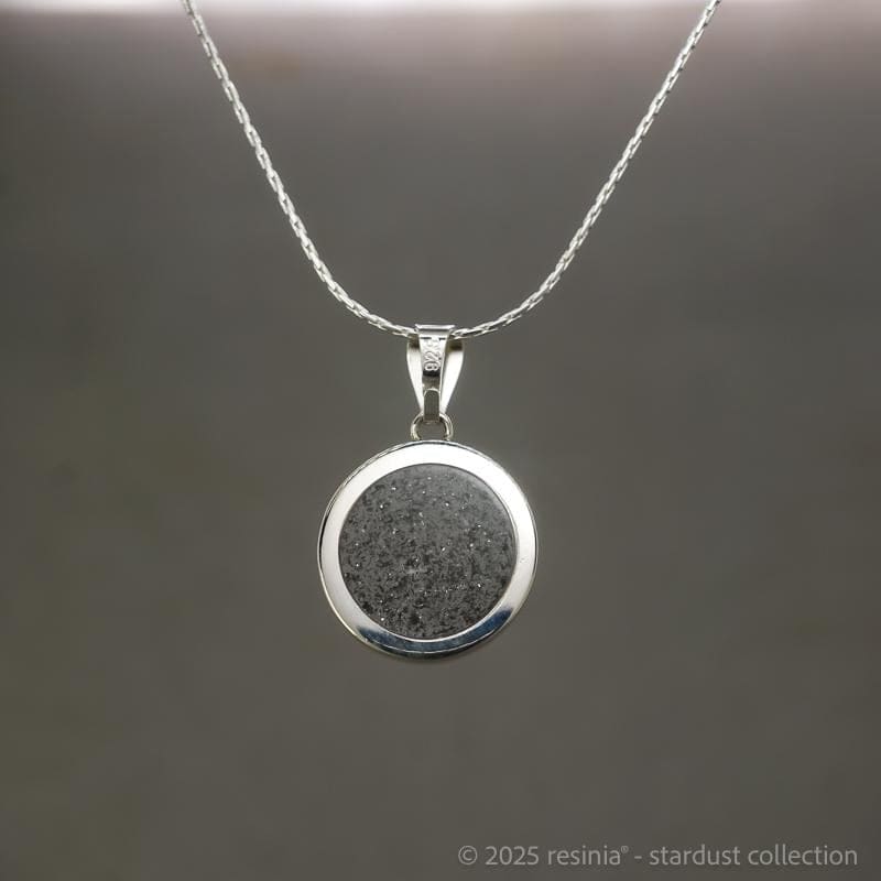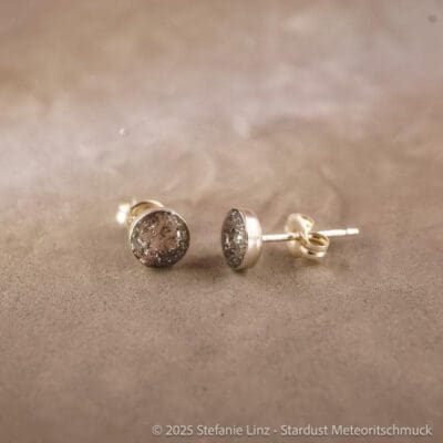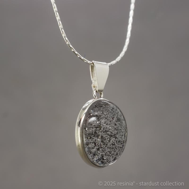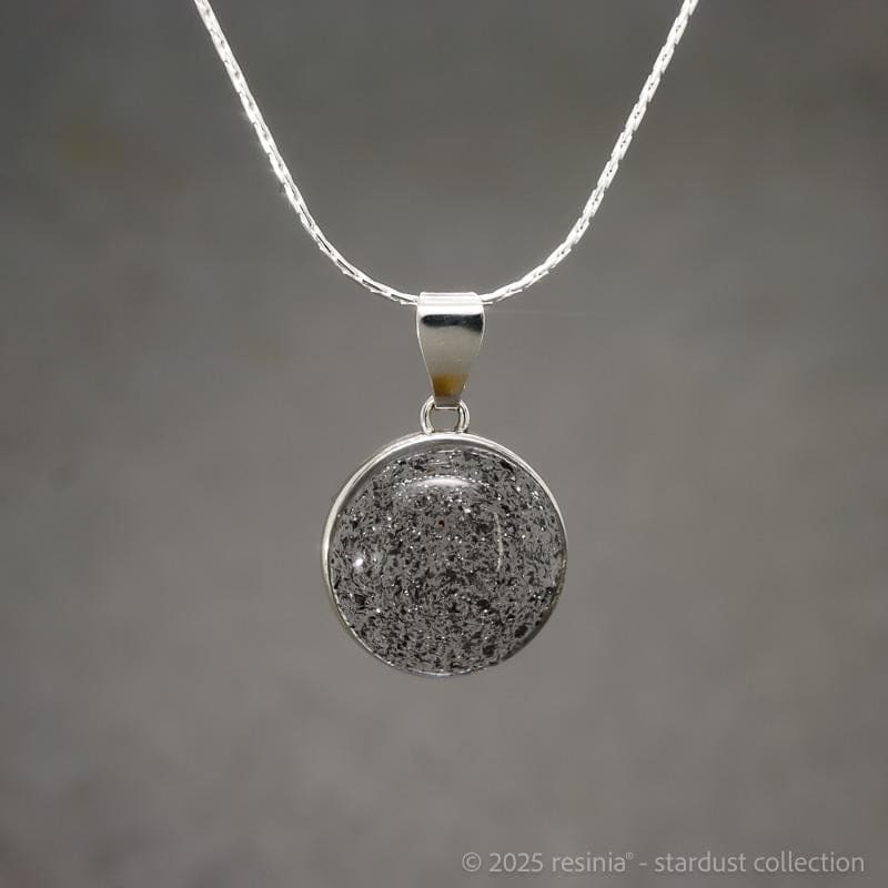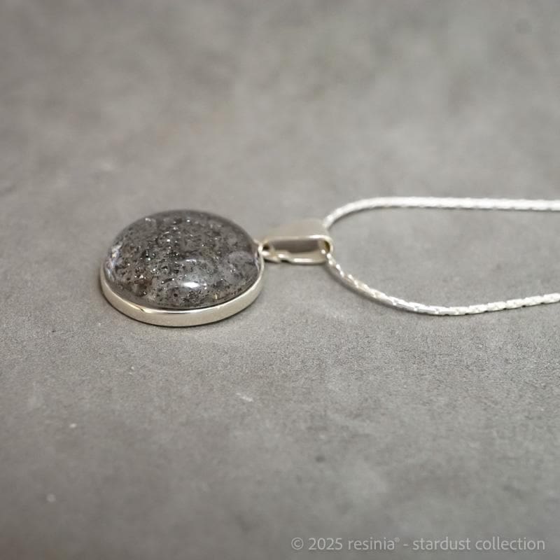 Verarbeitet wird echter Meteoritenstaub – Material aus der Entstehungszeit unseres Sonnensystems. Die transparente Fassung lässt das Licht durch das Schmuckstück fallen und verleiht dem Material eine besondere Tiefe.