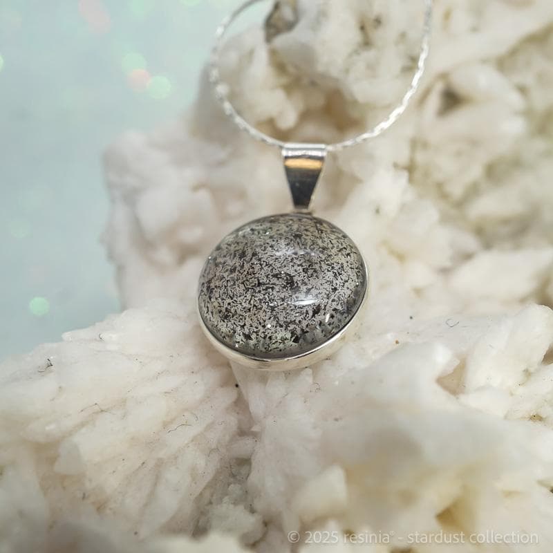 Das Amulett „Neptun“ zeigt feinen Meteoritenstaub in einer transparenten, lichtoffenen Fassung.