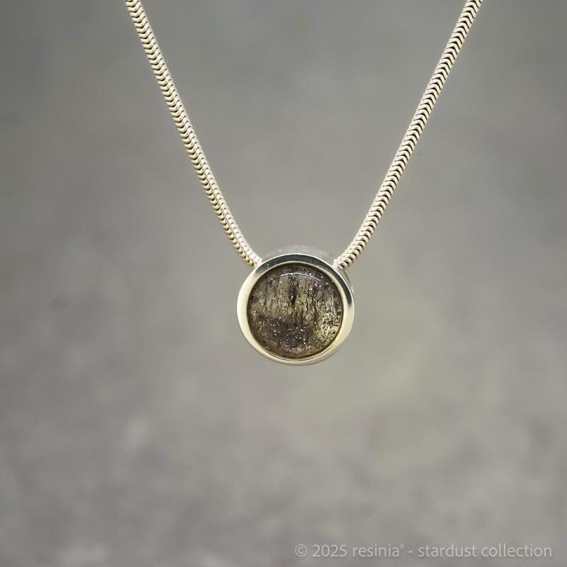 Das Amulett „Solis“ zeigt feinen Meteoritenstaub in einer kompakten, klar gefassten Form.