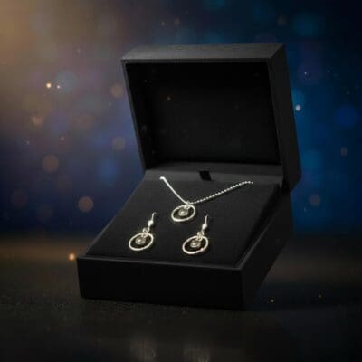 Feines Schmuckset mit echtem Meteoritenstaub: Anhänger und Ohrhänger in harmonischer Kombination – elegant, leicht und voller kosmischer Ausstrahlung.